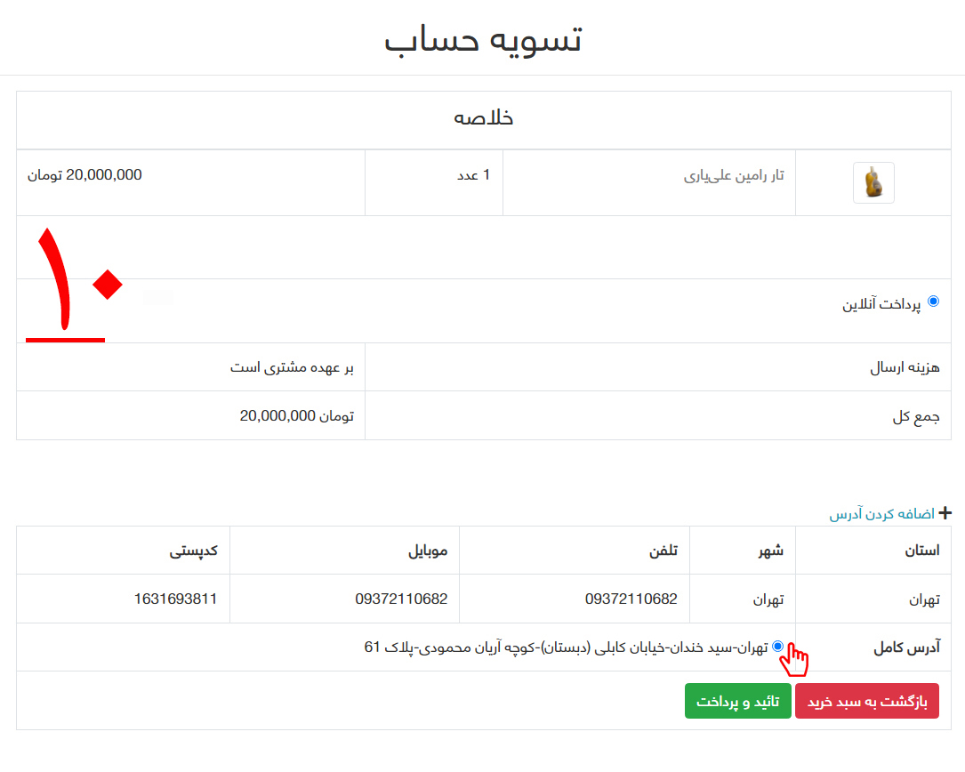 10-سپس همانطور که در تصویر شماره ده مشخّص شده است، آدرس رو انتخاب کرده و بر روی گزینه "تایید و پرداخت" کلیک کنید.