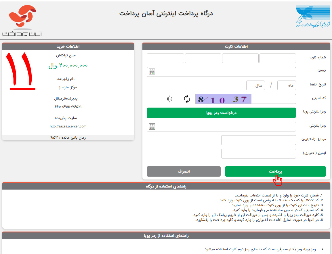 11-پس از کلیک بر روی گزینه "تایید و پرداخت"، همانطور که در تصویر شماره یازده مشاهده میکنید، صفحه درگاه پرداخت اینترنتی برای شما باز میشود. پس از وارد کردن اطّلاعات کارت بانکی و کلیک بر روی گزینه "پرداخت"، خرید شما نهایی میشود.