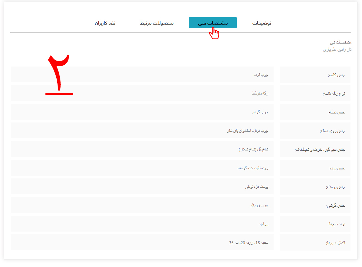 2-جهت اطّلاع از خصوصیات، مواد اوّلیه و سایر جزئیات محصول، همانطور که در تصویر شماره دو مشخّص شده است، بر روی گزینه "مشخّصات فنی" کلیک کرده و از تمامی جزئیات فنّی محصول مطّلع شوید.