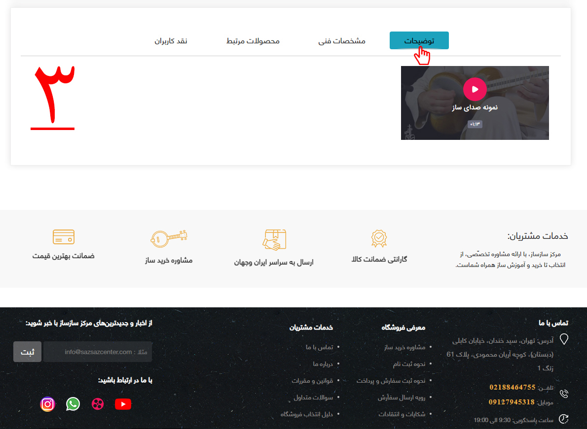 3-جهت شنیدن نمونه صوتی ساز مورد نظر، همانطور که در تصویر شماره سه مشخّص شده است، بر روی گزینه "توضیحات" کلیک کرده و نمونه صوتی و تصویری ساز مورد نظر را بشنوید و مشاهده کنید.