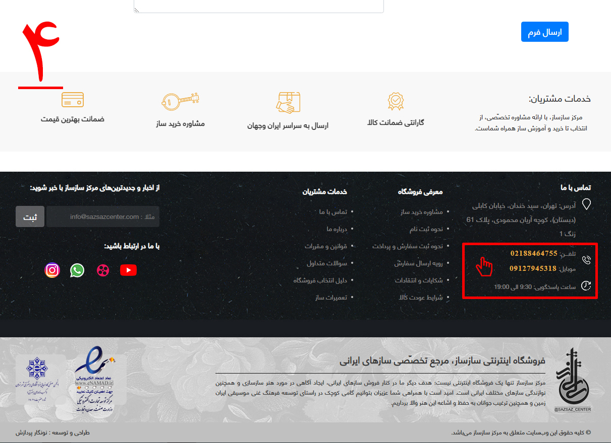 4-پس از حصول اطمینان از انتخاب محصول مورد نظر، حتماً با پشتیبان وبسایت مرکز سازساز تماس حاصل کرده و از زمان تحویل و سایر جزئیات محصول مورد نظر مطّلع شوید. همانطور که در تصویر شماره چهار مشخّص شده، شمارههای تماس با پشتیبان در پایین صفحه اصلی درج شده است.