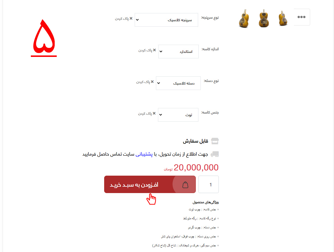 5-سپس همانطور که در تصویر شماره پنج مشخّص شده است، بر روی گزینه "افزودن به سبد خرید" کلیک کنید.