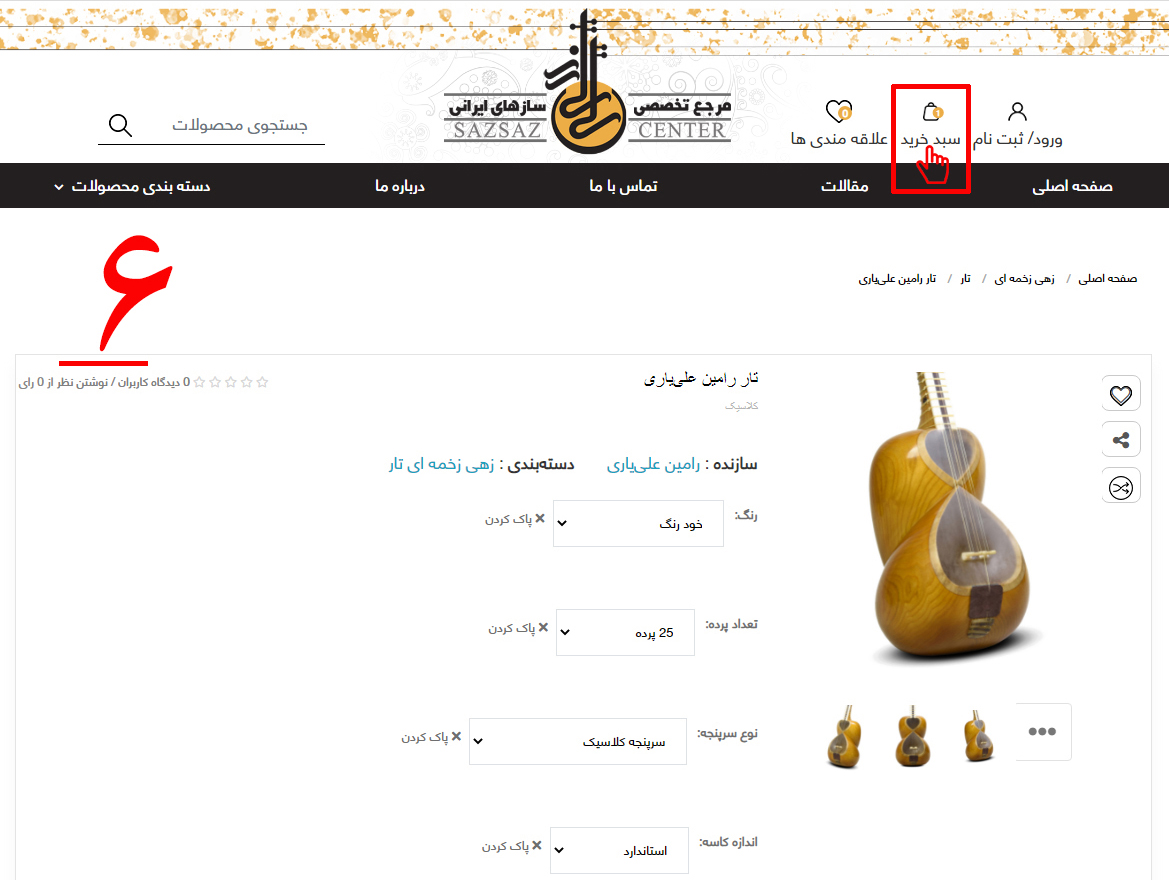 6-سپس همانطور که در تصویر شماره شش مشخّص شده است، بر روی گزینه "سبد خرید" کلیک کنید.