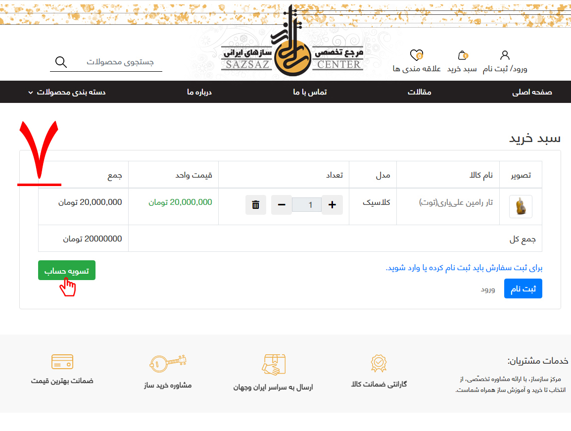 7-پس از چک کردن تمامی موارد و حصول اطمینان از جزئیات سفارش، همانطور که در تصویر شماره هفت مشخّص شده است، بر روی گزینه "تسویه حساب" کلیک کنید.