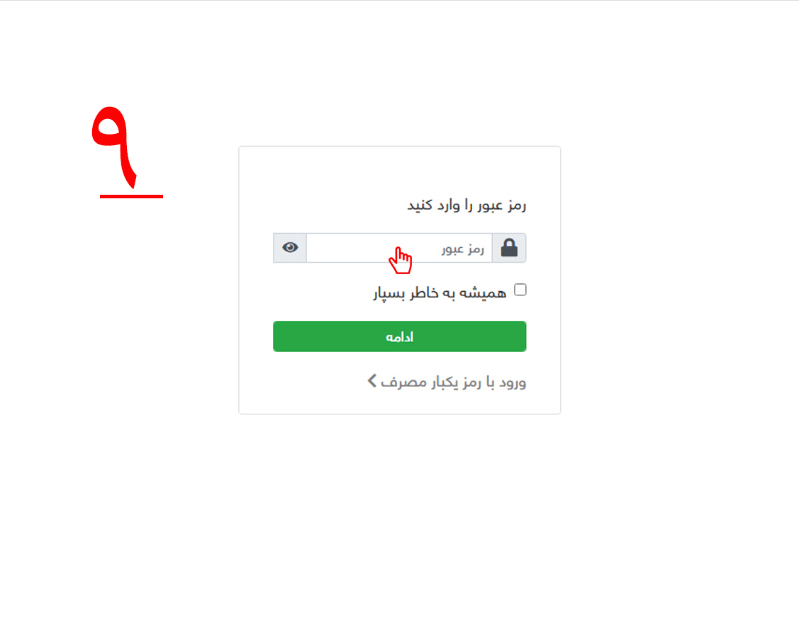 9-سپس همانطور که در تصویر شماره نه مشاهده میکنید، رمز عبور رو در قسمت مشخّص شده وارد کرده و بر روی گزینه "ادامه" کلیک کنید.